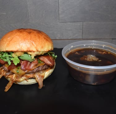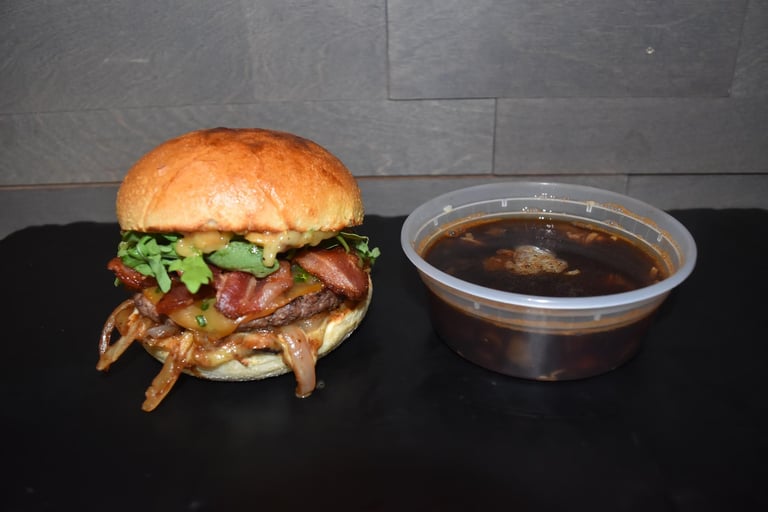 Indulge in our exclusive limited-time burger, featuring a toasted gourmet bun with a generous spread of our signature peppercorn garlic aioli. This creation is layered with two crispy bacon slices, fresh arugula, and chopped chives, all complemented by balsamic-glazed caramelized onions and a slice of smoked gouda atop a freshly pressed 4oz beef patty. For an elevated experience, we suggest dipping your burger into our rich French onion soup topped with Swiss cheese, or savoring it solo for a delightful treat.